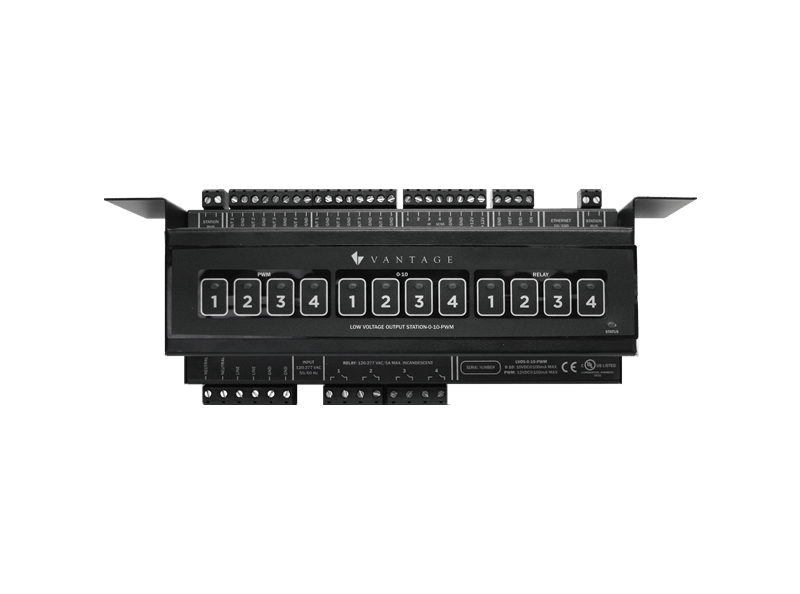 This low-voltage output station is used for controlling up to eight LED lighting loads that require either 0-10V or PWM for dimming control. Each station features four 0-10 outputs, four PWM outputs and four high-voltage relays.
